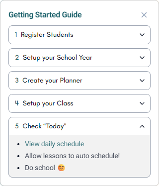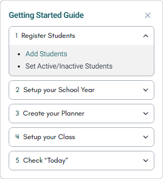 When you log in, you'll land on the Today page. You will see a message with instructions that will help you setup your school year. For now, we will ignore it and just follow step 1 of the guide and go to he Students page to add students.